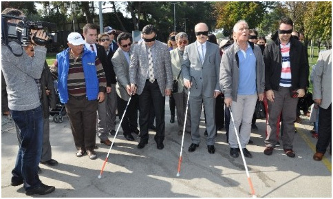 Dünya Beyaz Baston Günü münasebetiyle düzenlenen yürüyüşte gözleri bağlanan Altıeylül Belediye Başkanı Zekai Kafaoğlu ve Türk...