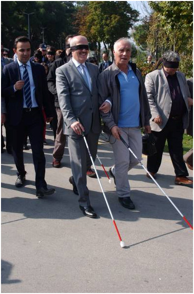 Dünya Beyaz Baston Günü münasebetiyle düzenlenen yürüyüşte gözleri bağlanan Altıeylül Belediye Başkanı Zekai Kafaoğlu ve Türk...
